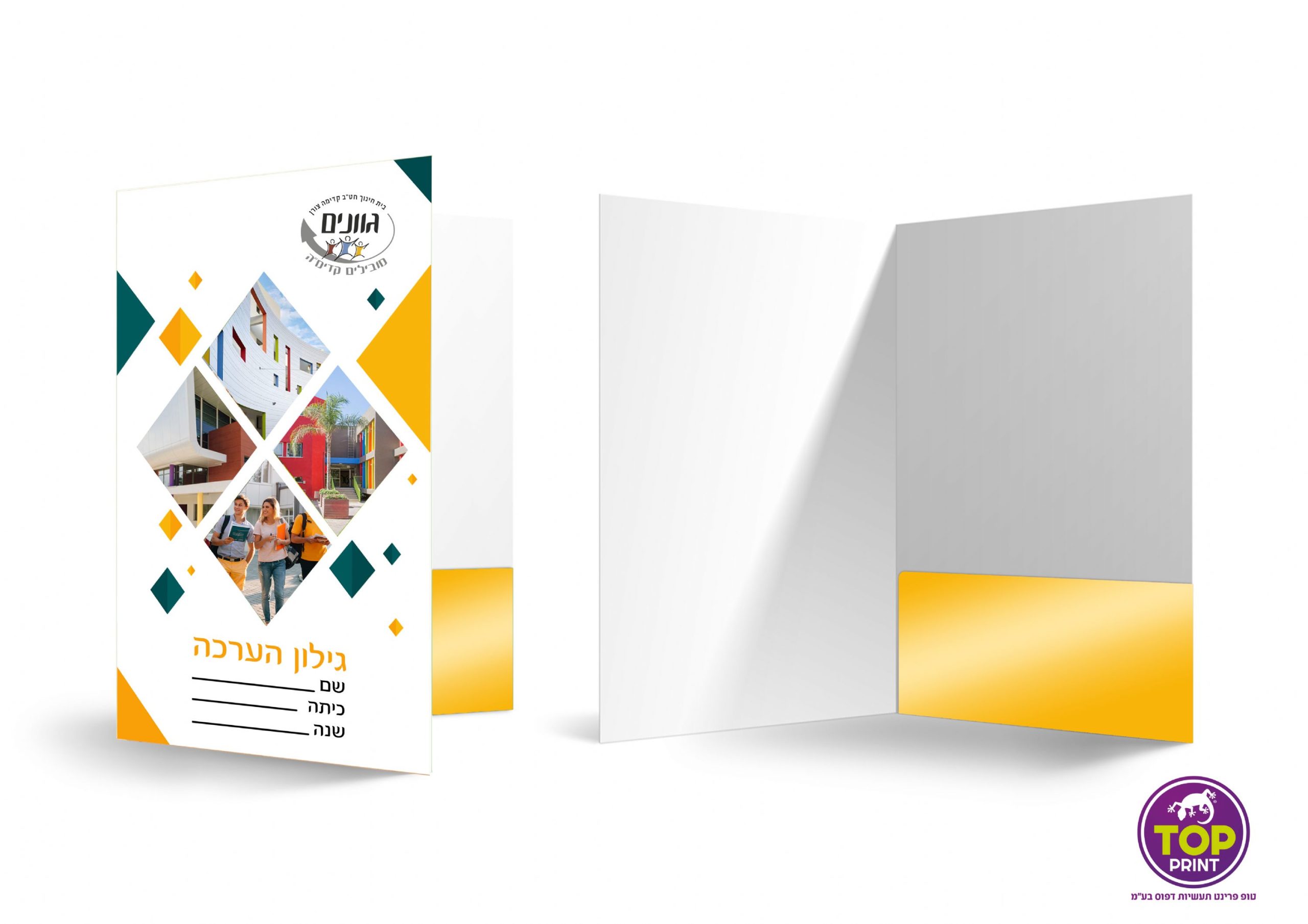 אצלנו תוכלו להזמין פולדרים בהתאמה אישית מלאה – החל מהעיצוב הגרפי, דרך בחירת סוג הנייר ועד לגימור הסופי. אנו מציעים אפשרות להדפסת פולדרים עם כיס אחד או שני כיסים, בהתאם לצורך ולשימוש בפועל. כיסים אלה נועדו להחזיק דפי מידע, חוזים, קטלוגים, כרטיסי ביקור ועוד – בצורה מסודרת ומכובדת.